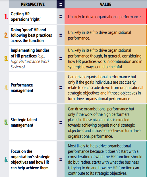 Sammenhengen mellom hva HR faktisk gjør, og organisasjonens resultater kan være uklare og til tider vanskelig å måle. HR påvirker ikke virksomhetens prestasjoner i så stor grad som de kan.