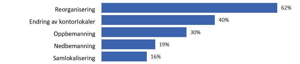 Det etterlates liten tvil i årets undersøkelse om at norske organisasjoner har opplevd store endringer det siste året. Hele 75 % av respondentene opplever at organisasjonen har gjennomført større endringer i arbeidsprosesser de siste 12 månedene enn det som har vært normalt hvert av de foregående fem årene. Det siste året har bragt fremtiden til oss mye raskere enn vi var forberedt på.