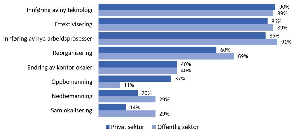 Årets undersøkelse viser at de som deltok i undersøkelsen på tvers av sektorer og bransjer forventer at de står overfor store endringer de neste årene. Likevel er det noen forskjeller mellom privat og offentlig sektor som sannsynligvis kan knyttes til mulighetsrommet de to sektorene har fremover. Respondentene fra offentlig sektor mener de store endringene vil komme fremover, mens respondentene fra privat sektor i større grad svarer at de forventer at endringstakten vil være den samme eller minskes. I tillegg skiller svarene fra de to sektorene seg når det gjelder hvilke endringer de forventer fremover.