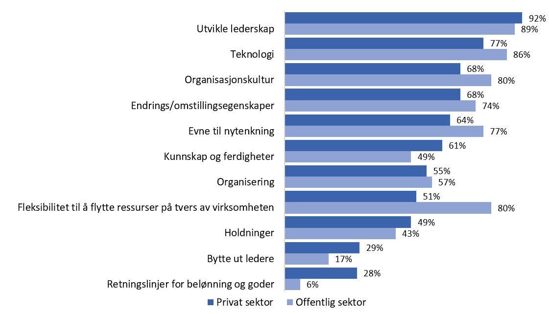 Respondentene fra begge sektorer er derimot enige om at utvikling av ledere er den høyest prioriterte endringen fremover for å møte endrede omgivelser.