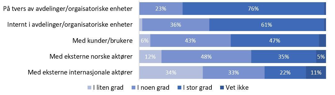 Undersøkelsen viser også at det har oppstått økt behov for samarbeid det siste året (se figur 5). 76 % svarer at de i stor grad har opplevd økt behov for samarbeid på tvers av avdelinger eller organisatoriske enheter de siste 12 månedene. 61 % oppgir å i stor grad ha opplevd økt behov for samarbeid internt i avdelinger eller organisatoriske enheter. 47 % har i stor grad økt behov for samarbeid med kunder. Det økte behovet for samarbeid kan være knyttet til flere faktorer, for eksempel kan organisasjoner ha møtt på mer komplekse problemstillinger og ha hatt et økt behov for innovasjon. Uansett bakgrunn kan mer samarbeid på tvers potensielt være en driver for at ledere opplever å ha mindre kontroll over egne ressurser enn tidligere, og at kompleksiteten i og behovet for koordinering av arbeidet som utføres øker.