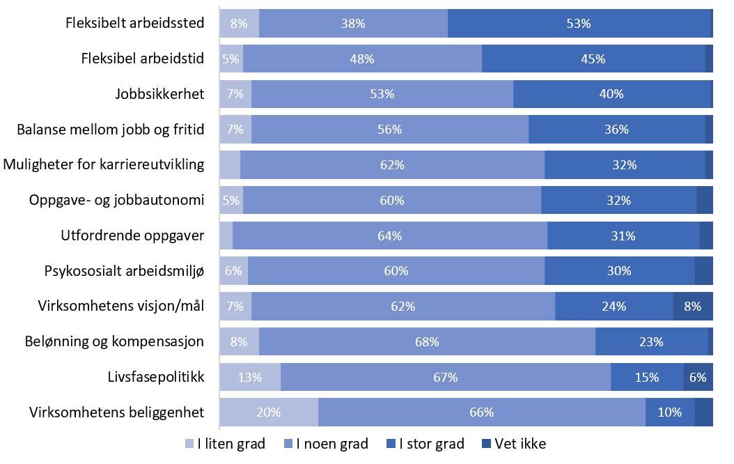I tillegg viser undersøkelsen at ansattes forventninger til arbeidsgiver har økt på en rekke områder. 60 % oppgir at ansattes forventninger om fleksibelt arbeidssted i stor grad har endret seg det siste året. Av alternativene i undersøkelsen er det dette området hvor ansattes forventninger synes å ha økt mest fra tidligere undersøkelser. 34 % svarer også at ansattes forventninger om fleksibel arbeidstid i stor grad er endret. 29 % opplever ansattes forventninger om utfordrende oppgaver og muligheter for karriereutvikling har endret seg i stor grad. Det å imøtekomme ansattes forventninger om mer fleksibilitet og i tillegg mer utfordringer og muligheter, krever nye lederegenskaper. Kompleksiteten øker ytterligere når dette i stor grad må gjennomføres via fjernledelse både nå, og sannsynligvis også fremover, i større grad enn tidligere.