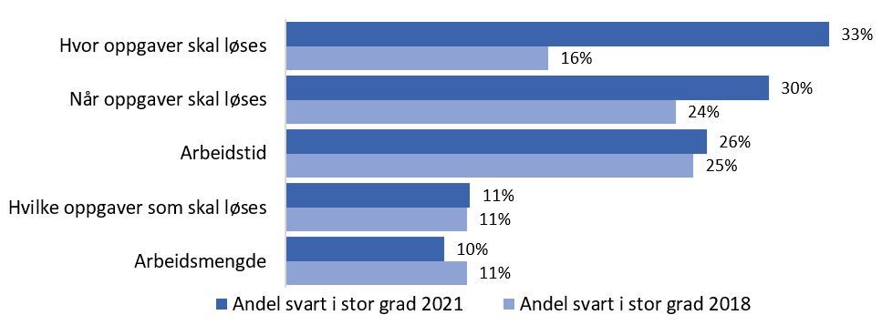 De som svarte på undersøkelsen oppgir at deres organisasjoner gir medarbeiderne mer autonomi enn tidligere. Andelen som oppgir at medarbeidere i deres organisasjon i stor grad har frihet til å bestemme selv har økt innen nesten samtlige kategorier siden 2018. Økningen er størst når det kommer til hvor arbeidsoppgaver skal løses (fra 16,1 % i 2018 til 33,3 % i 2021). Arbeidsmengde er det eneste området der vi ser en nedgang i autonomi fra 2018. Her har andelen som sier at medarbeidere i deres organisasjon i stor grad kan bestemme fritt sunket fra 11,1 % til 9,7 %.