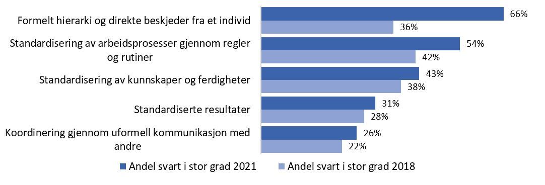 Respondentene opplever at deres organisasjoner bruker ulike former for koordinering, og at standardisering skjer i økt grad. Vi legger her spesielt merke til at det er vesentlig større grad av koordinering gjennom formelt hierarki og direkte beskjed enn det var fra de som deltok i undersøkelsen i 2018. Vi legger også merke til en større økning i bruken av standardisering gjennom regler og rutiner enn på de andre koordineringsmekanismene. Dette er interessant fordi både formelt hierarki og direkte beskjed, samt koordinering gjennom regler og rutiner kan fortolkes som at det er en utvikling i retning av at beslutninger i noe mindre grad overlates til medarbeiderne. Som Mintzberg (1979) viste, så er standardisering av resultater, og av kunnskaper og ferdigheter koordineringsmekanismer som brukes i det profesjonelle byråkratiet og av divisjonsbaserte organisasjoner. Koordinering gjennom uformell kommunikasjon er mer utbredt i mer innovative organisasjoner. I alle kategoriene av tilnærminger for å følge opp ansatte, ser vi en økning i høye svar (tilsvarende i stor grad) i 2021 sammenlignet med 2018. Dette er potensielt et symptom på at lederhverdagen er blitt mer krevende enn tidligere og at ledere opplever å ha mindre oversikt over ansattes arbeidsutførelse.