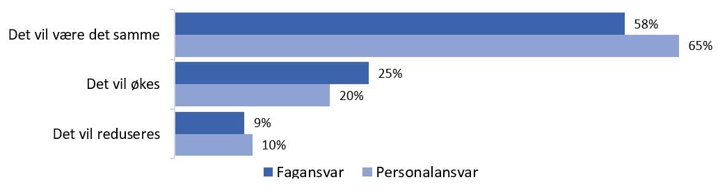 Videre er variasjonen i lederspenn stor. Lavest rapporterte verdi for fag- og personalansvar her henholdsvis 0 og 1, mens høyeste rapporterte verdi felles på 100. 24 % av respondentene oppgir at en typisk leder i deres organisasjon har personalansvar for 15 eller flere medarbeidere, mens 13 % oppgir 20 eller flere. Samtidig tror kun et fåtall av respondentene at det antallet medarbeidere en typisk leder har ansvaret for vil reduseres fremover (figur 9). I tilfeller der lederspennet er stort, vil det nødvendigvis være vanskeligere for ledere å sikre tett og god oppfølging av sine medarbeidere. Dette må likevel sees i sammenheng med lederens kapasitet og den enkelte medarbeiders behov for ledelse.