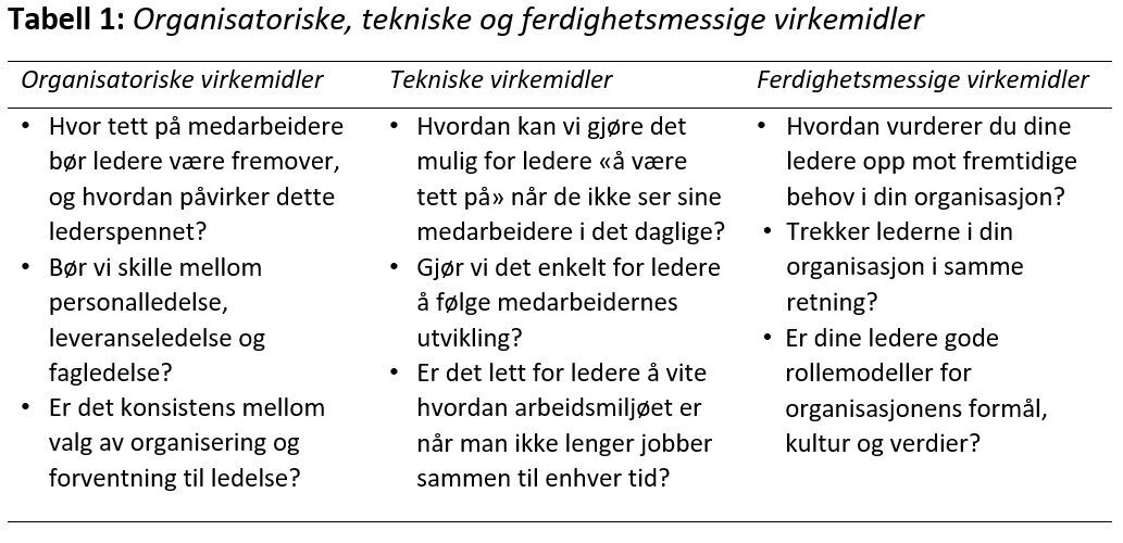 Det er rimelig å anta at det siste årets endringer vil prege fremtidens arbeidsliv. Dette stiller nye krav til ledelse (Groysberg og Seligson, 2020). Å lede i en tid der endring er kontinuerlig, gjennomgripende og allestedsnærværende, gir behov for nye tilnærminger. Ledelse under kriser og stadige endringer nødvendiggjør at ledere oppgaveorienterte, endringsorienterte og relasjonsorienterte. Dette er en krevende øvelse (Dirani et al., 2020; Groysberg og Seligson, 2020; Bartsch et al., 2020). Ledelse utøves stadig oftere digitalt, nå som endringstakten ikke ser ut til å avta fremover. Dette stiller økte krav til ledere sammenlignet med tidligere (Bartsch et al., 2020). Vi setter spørsmålstegn ved hvorvidt norske organisasjoner gir sine ledere rom til å utøve god ledelse i denne nye hverdagen.