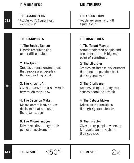 Wiseman har studert en mengde ledere og sett på hvordan deres atferd overfor ansatte påvirker hvor mye de klarer å hente ut av den enkelte. Ledere som får mest ut av sine medarbeidere kaller hun Multipliers. De som ligger på motsatt side av spekteret kaller hun Diminishers. Og det er stor forskjell mellom de to. Der Diminishers får ut mindre enn 50% av sine medarbeideres kapasitet, får en Multiplier ut dobbelt så mye. Mens 43% av ledere karakteriseres som Diminishers, finner vi 10% i kategorien Multipliers. Resten faller et sted imellom.